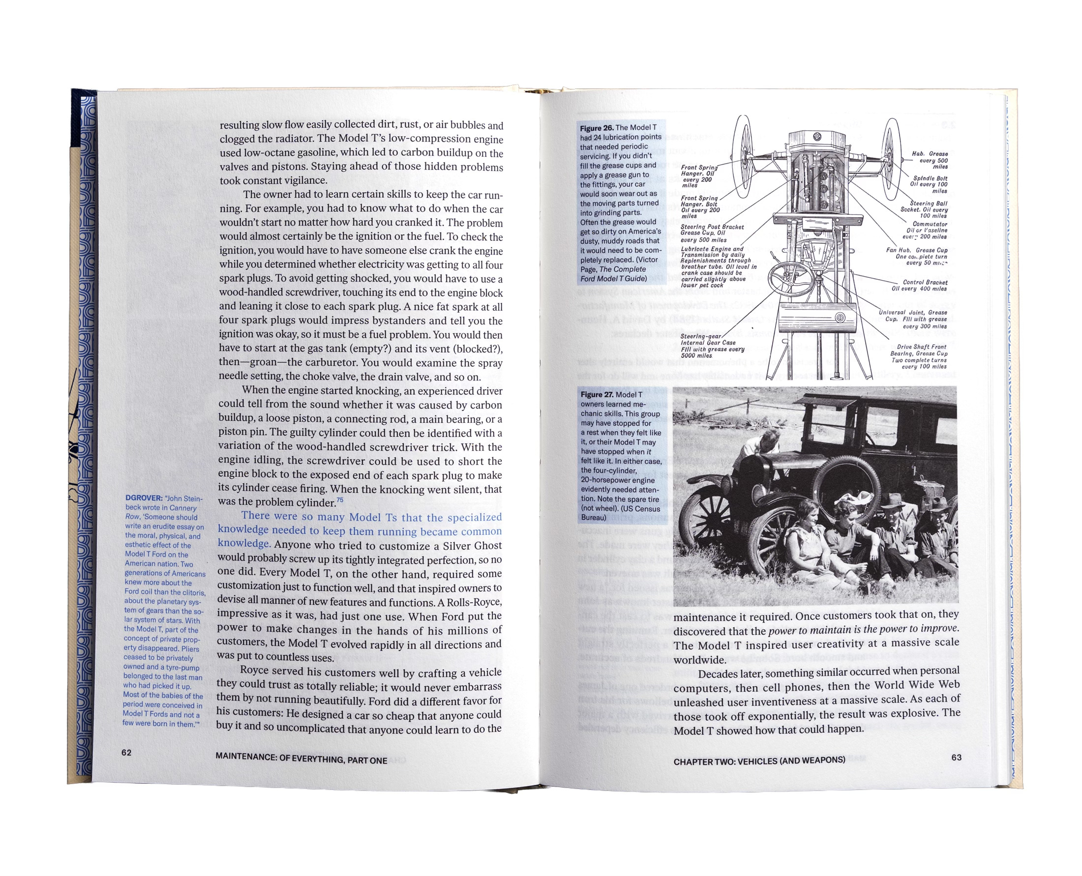 The book opens with the 1968 Golden Globe Race, in which nine sailors set off to circumnavigate the globe alone, each with their own approach to maintenance, and only one of them makes it to the end. From there it moves through motorcycle repair, the corrosion on the Statue of Liberty, military sustainment, YouTube tutorials, the Model T’s success…
